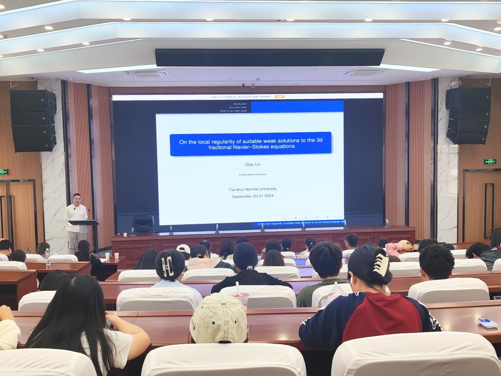 刘桥介绍了在分数阶Navier-Stokes方程组适定弱解的局部正则性相关结果, 这里的分数阶Navier-Stokes方程组即将经典Navier-Stokes方程组中Laplace算子-Δ替换成分数阶 Laplacian算子 (-Δ)^α其中α∈ (¾,1).