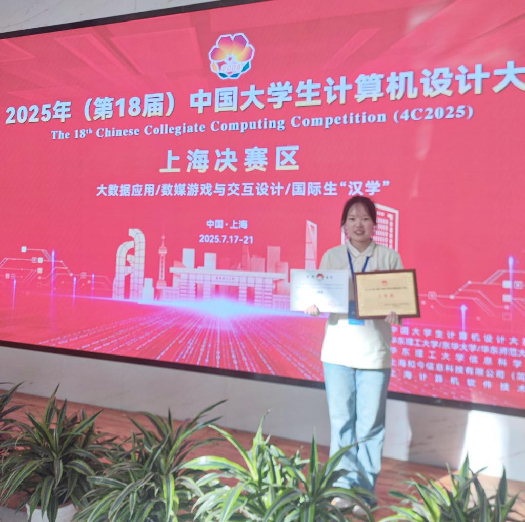 7月21日,2025年(第18届)中国大学生计算机设计大赛全国总决赛在上海华东理工大学圆满举行,本次赛事吸引全国500余支队伍同台竞技,经过紧张激烈的角逐,pp电子模拟器网站刘倩茹和机电与汽车工程学院林欣2名同学组成的团队,凭借作品《数览天水—大数据驱动的古城沉浸式导览系统》脱颖而出。在决赛现场,刘倩茹同学代表团队进行项目路演与答辩,通过出色的视觉呈现、清晰的方案阐述与自信的答辩互动,全面展示了该作品的创新价值与社会效益,在大数据应用赛道中荣获全国三等奖。