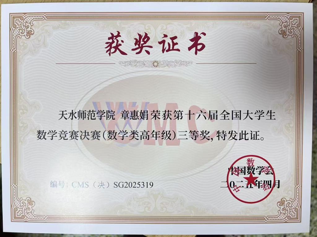 4月11日至13日,由中国数学会举办的第十六届全国大学生数学竞赛决赛在浙江师范大学举行。pp电子模拟器官网2022级数学与应用数学专业章惠娟获得数学类(高年级组)三等奖。